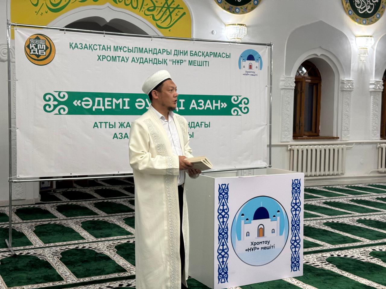 Хромтау ауданының бас имамы Ерік Қонақбайұлы жиналған қауымға азан айтудың дініміздегі орны мен Алла Тағаланың азаншыға дайындаған ақыреттік сыйы туралы айтып, Алла елшісінің (оған Алланың салауаты мен сәлемі болсын): «Кімде-кім жеті жыл сауабына сене отырып азан шақыратын болса, Алла осыны, оның тозақтан құтылуына кепілдік қылады», – деген хадисін жеткізді.