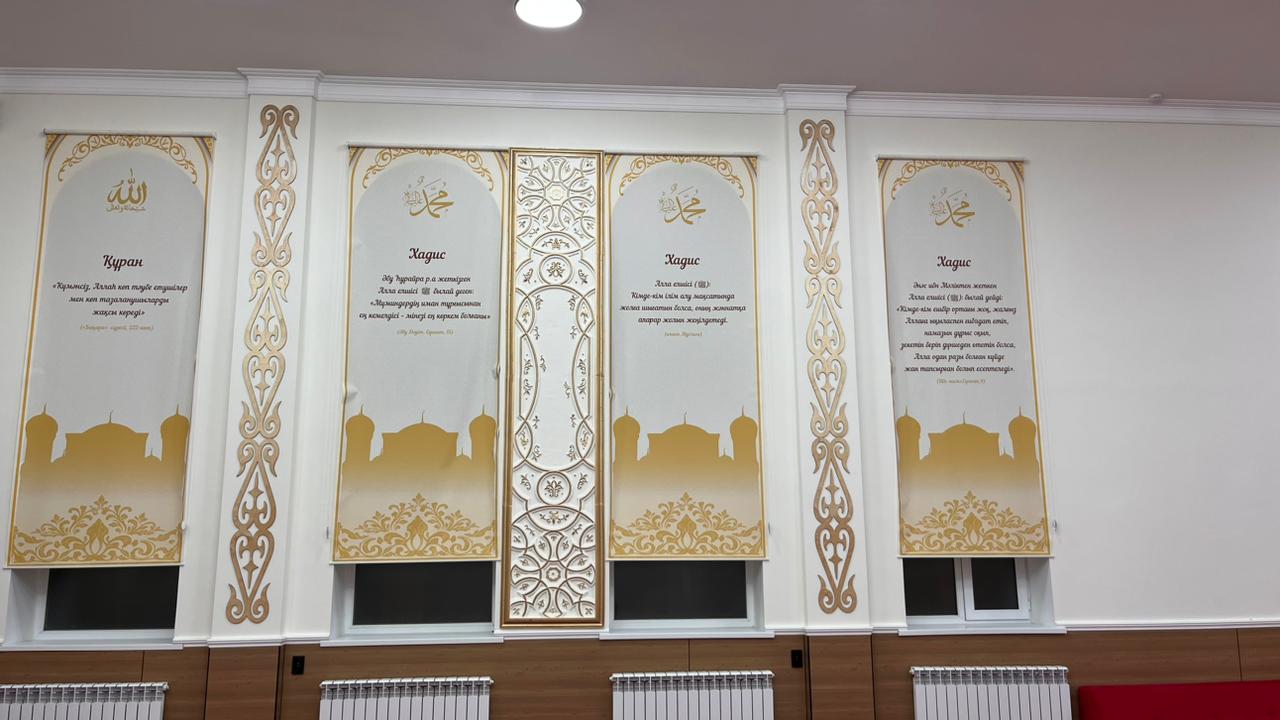 Перделер мешіт ажарын аша түсті. Онда Құран аяттары мен хадистер сөздері көркем түрде бейнеленген.