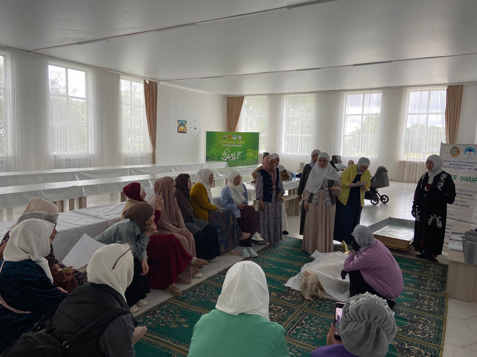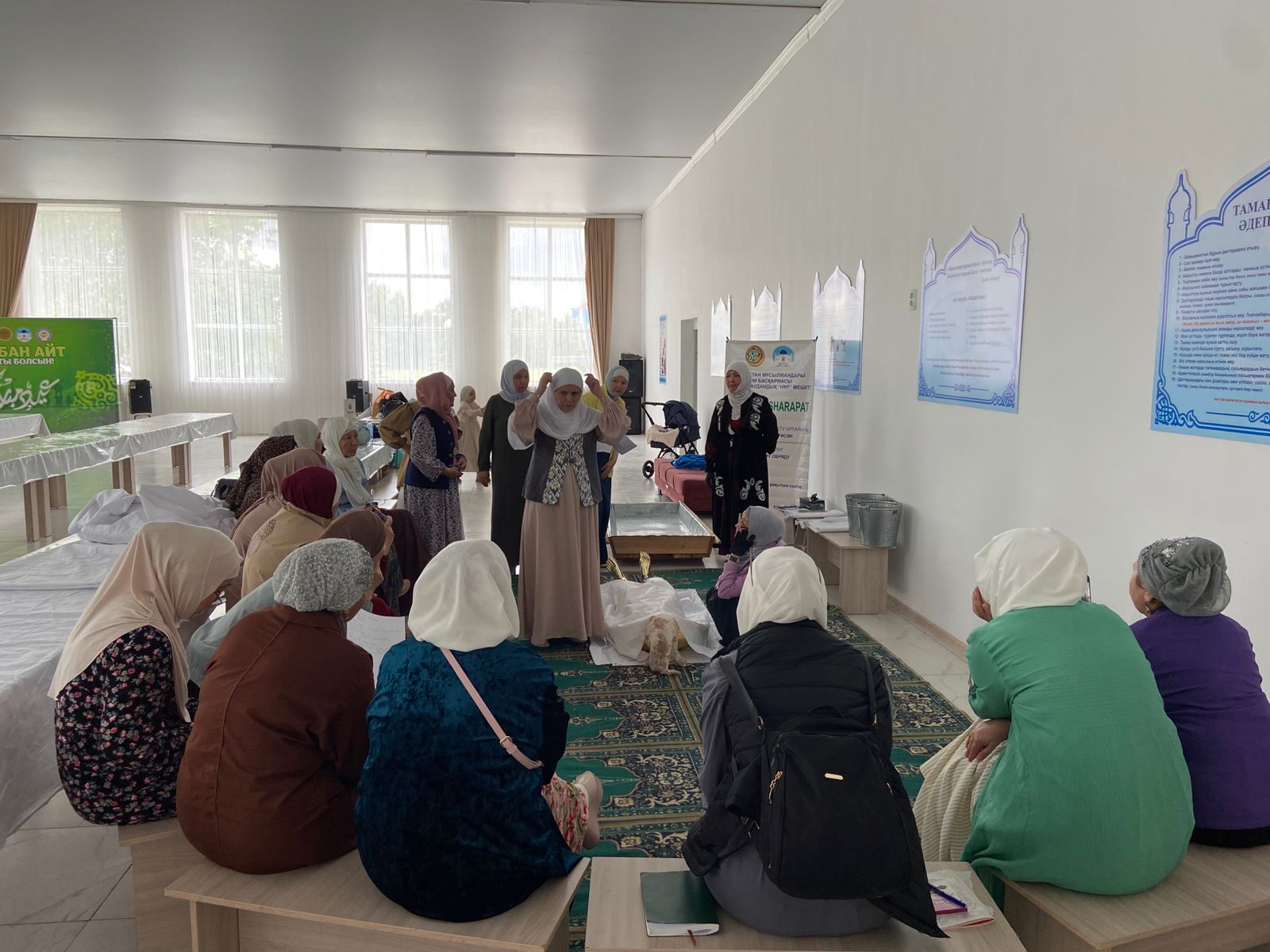 Хромтау аудандық «Нұр» мешітінде әйел жамағатына «Жаназа және жерлеу рәсімдері» тақырыбында практикалық сабақ ұйымдастырып, оны Ақтөбе облысы бойынша «Әйел-қыздар» секторының жетекшісі, облыстық орталық «Нұр Ғасыр» мешітінің ұстазы Кенжегүл Кушкарова өтті.