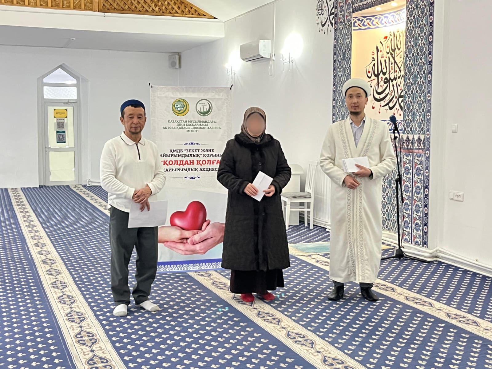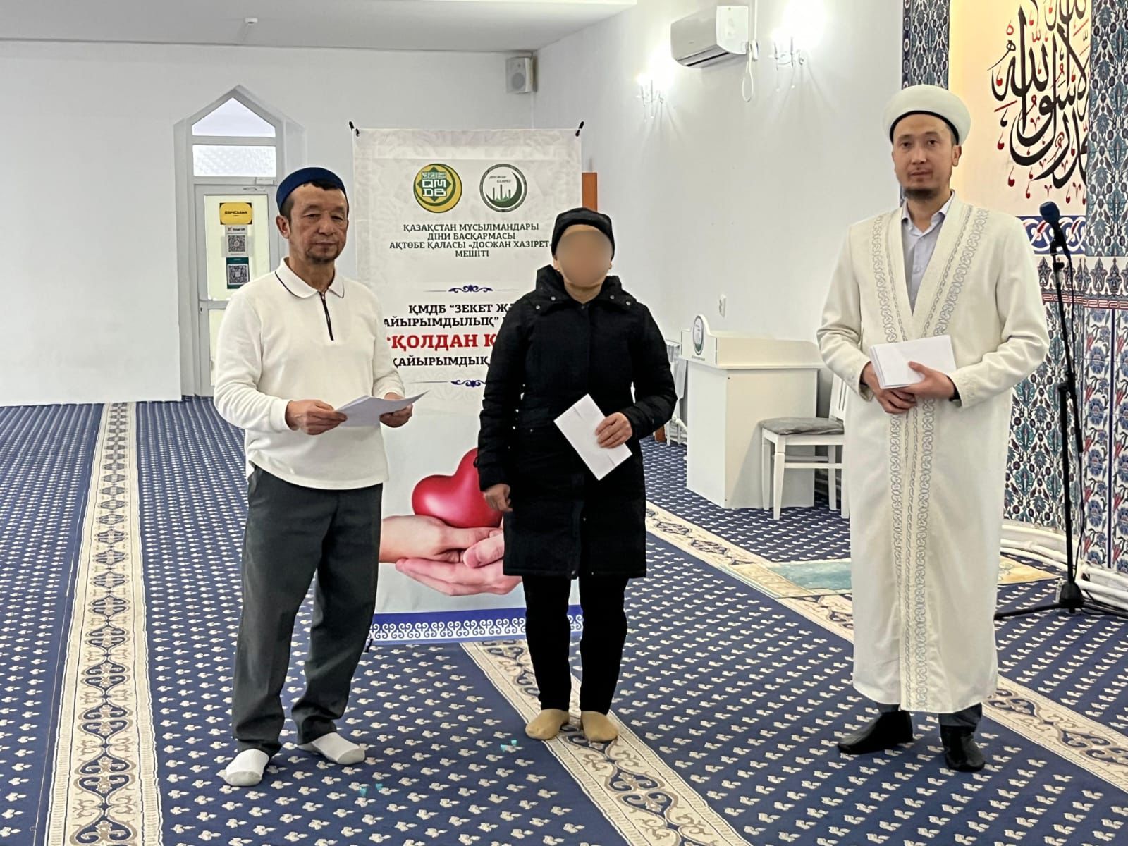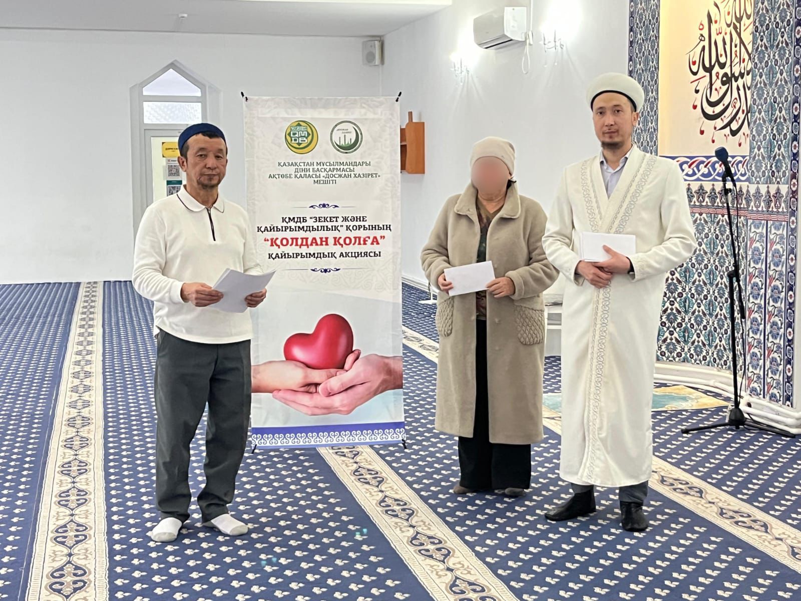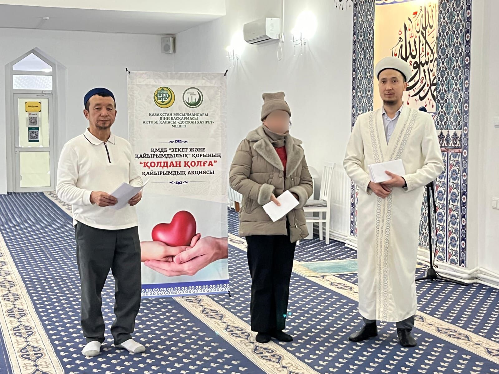 Ақтөбе қалалық «Досжан хазірет» мешітінің имамдарының ұйымдастыруымен «Қолдан-қолға» акциясы аясында мешітке өтініш білдірген 20 мұқтаж отбасыға зекет үлестірілді. Әр отбасына 50 000 теңгеден, жалпы 1 000 000 теңге қаражат берілді.