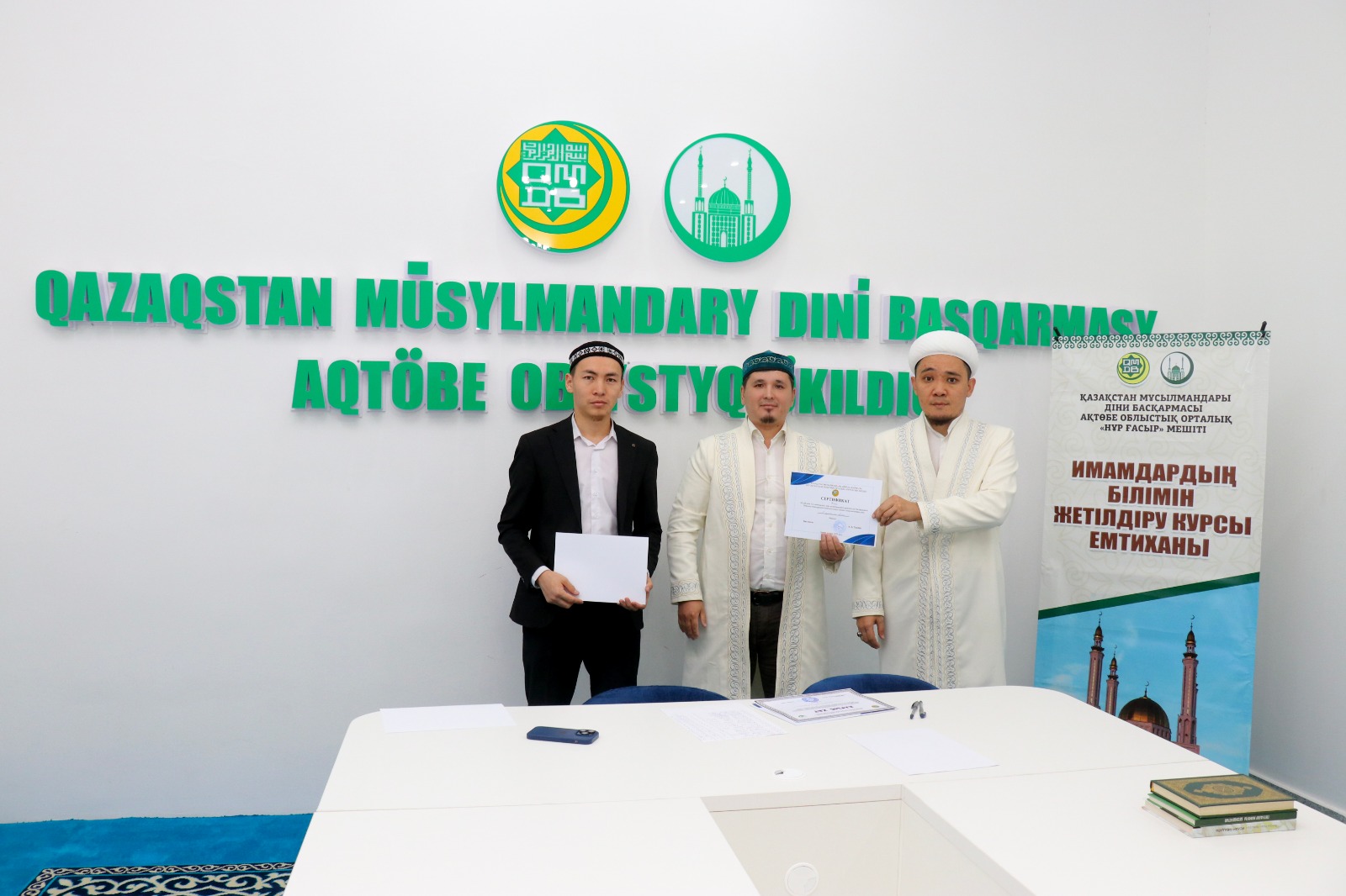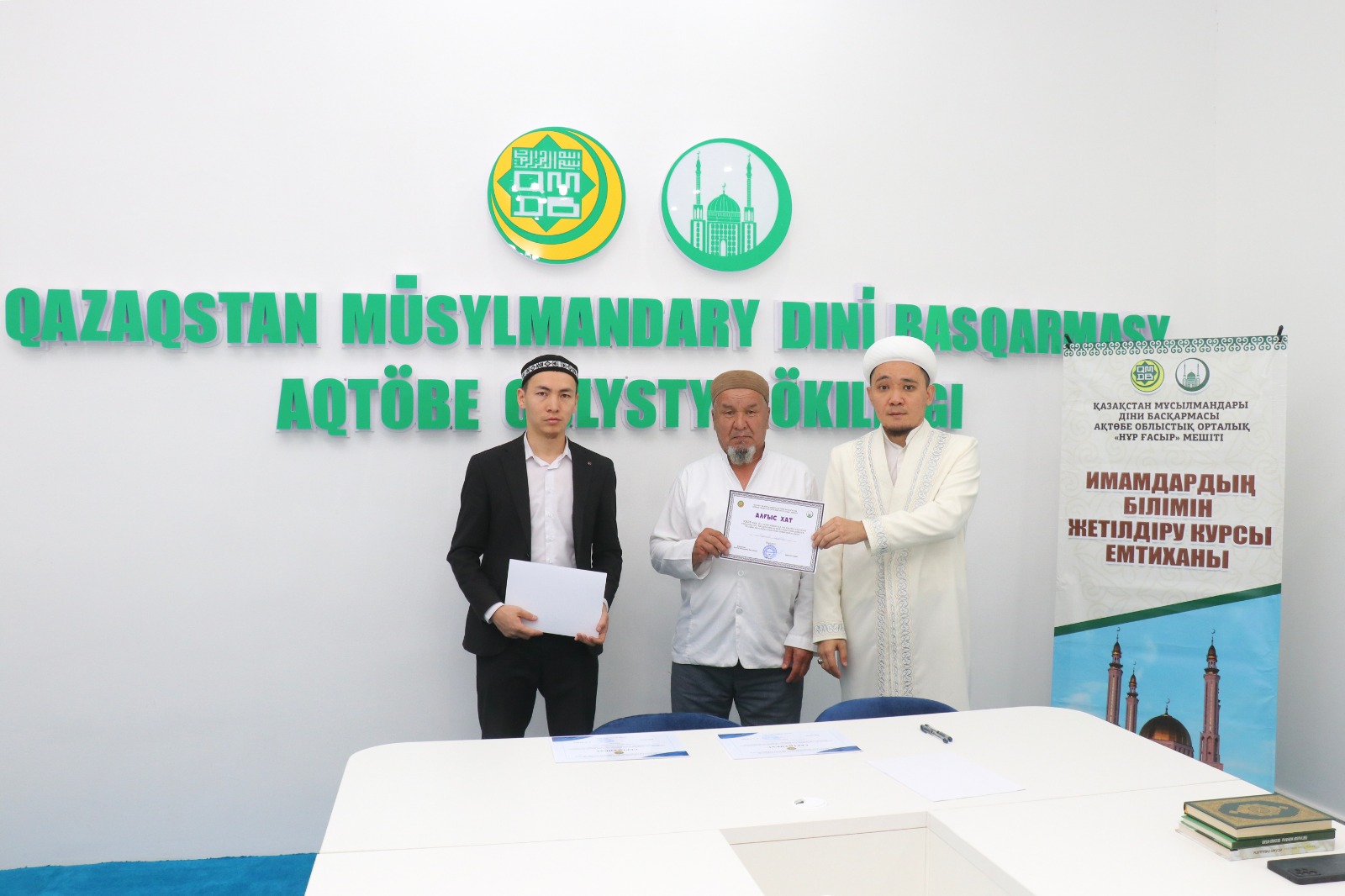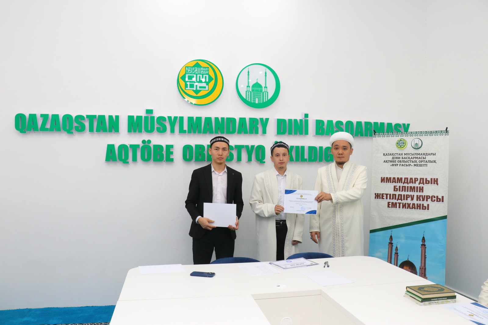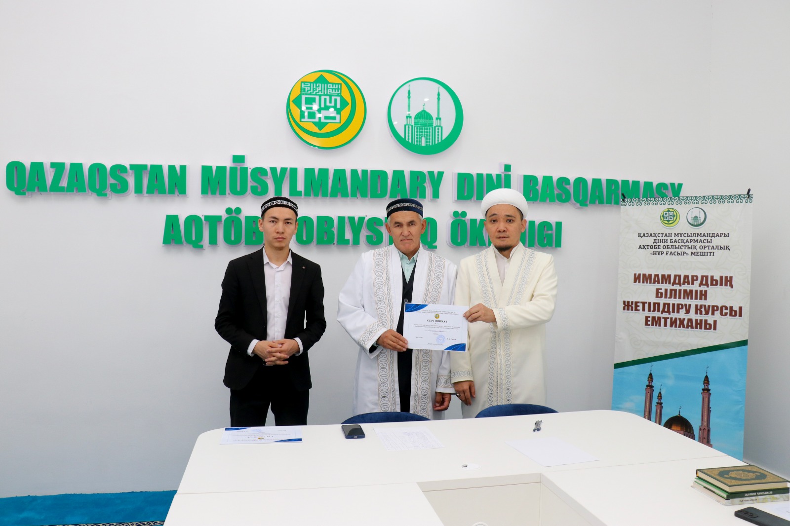 Емтихан соңында ҚМДБ-ның Ақтөбе облыстық орталық Нұр Ғасыр мешітінің наиб имамы Смағулов Нұрбол сертификаттар табыстап, дін жолындағы сауапты қызметтеріне сәттілік тіледі.
