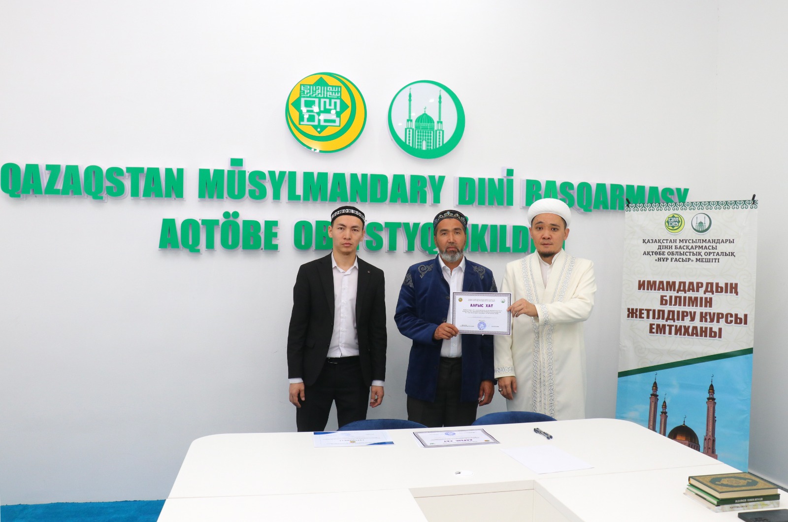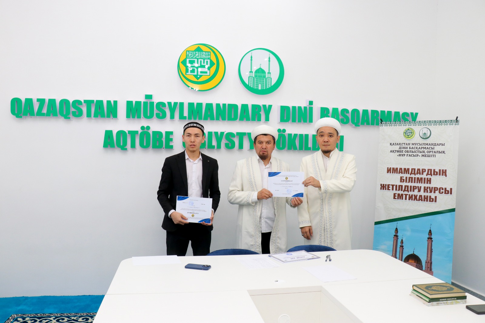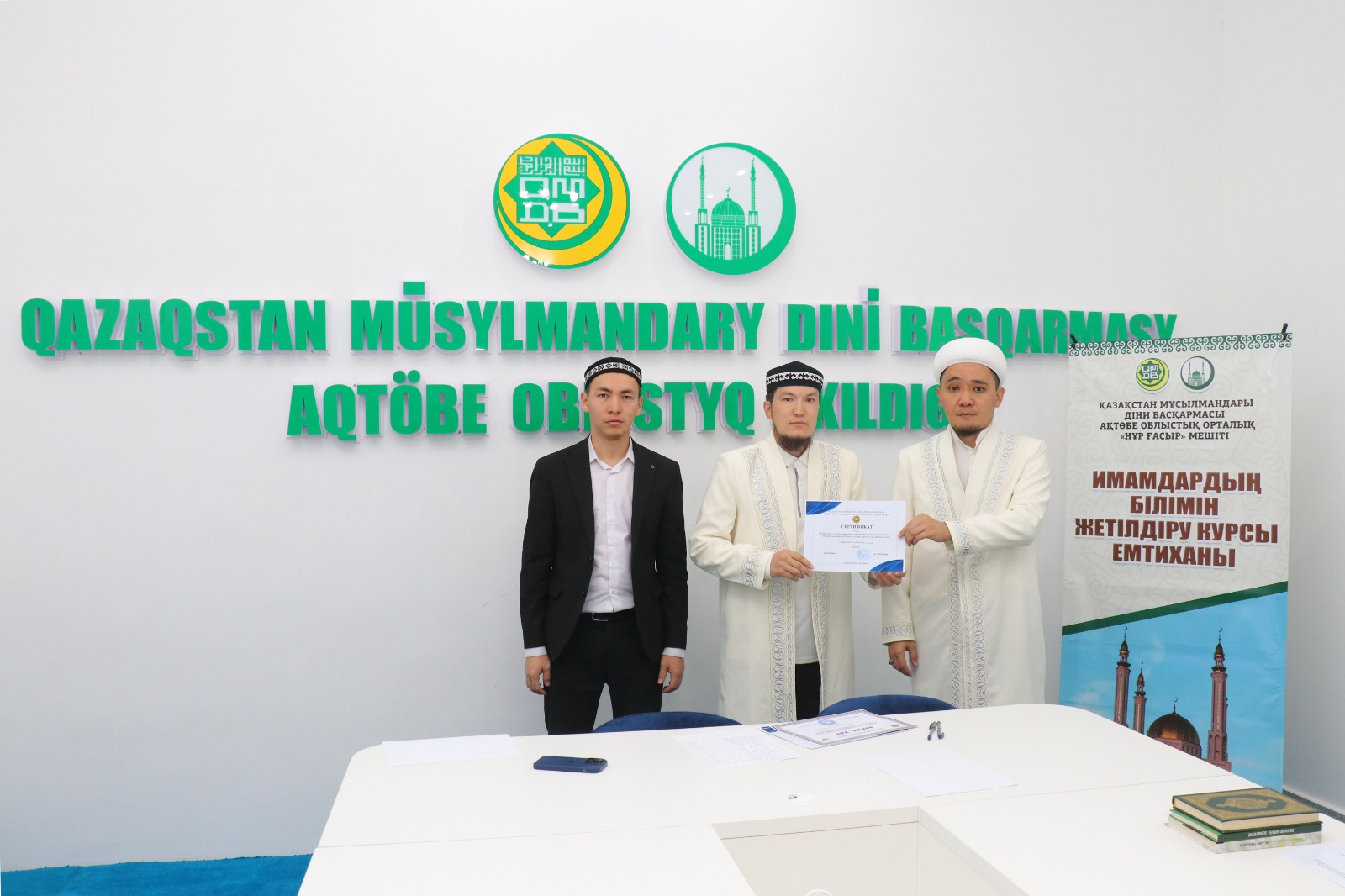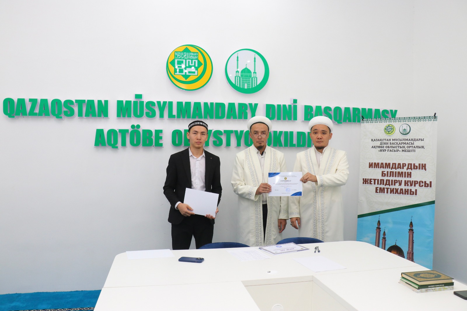 Емтихан соңында ҚМДБ-ның Ақтөбе облыстық орталық Нұр Ғасыр мешітінің наиб имамы Смағулов Нұрбол сертификаттар табыстап, дін жолындағы сауапты қызметтеріне сәттілік тіледі.