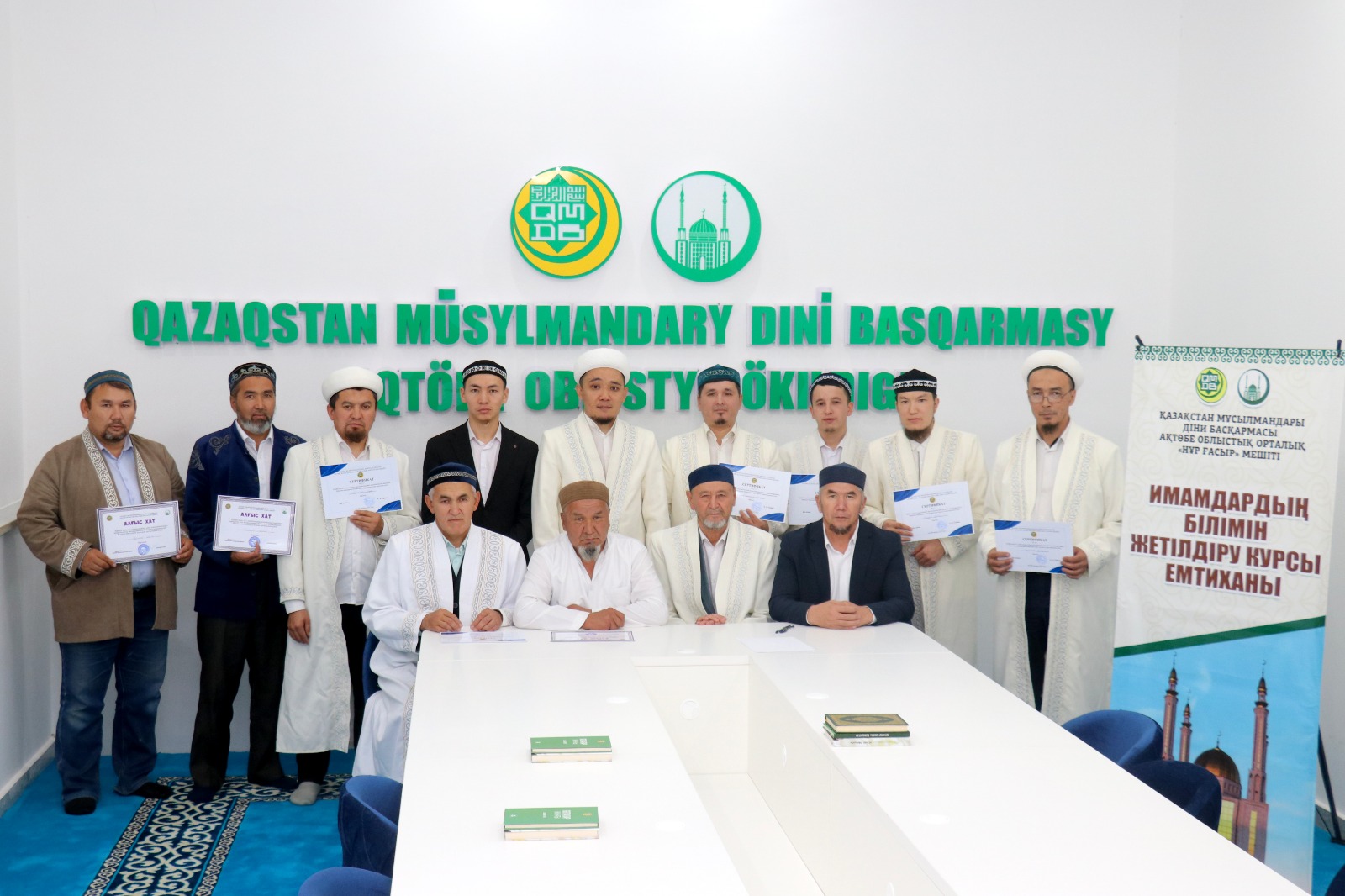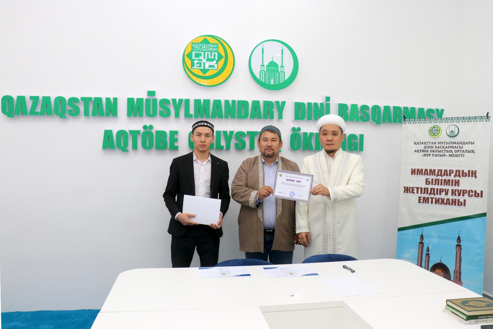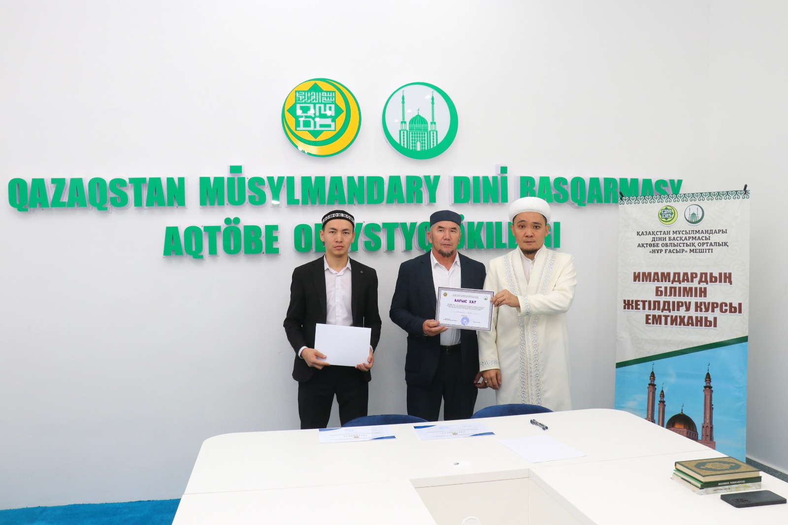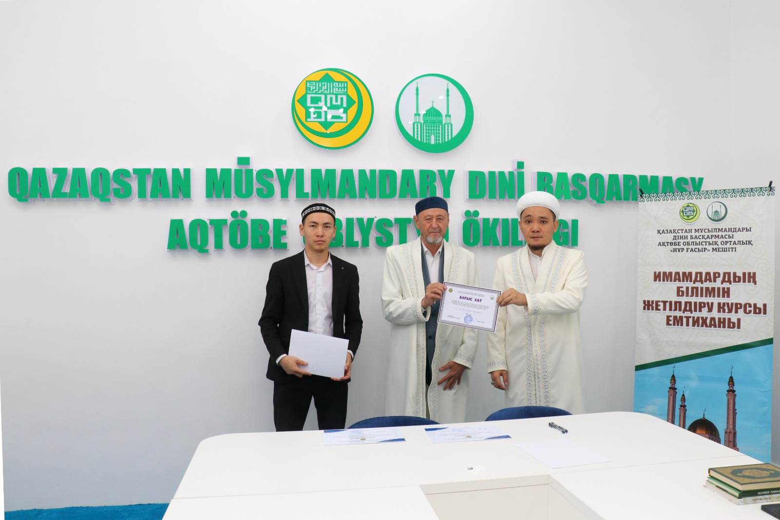 Емтихан соңында ҚМДБ-ның Ақтөбе облыстық орталық Нұр Ғасыр мешітінің наиб имамы Смағулов Нұрбол сертификаттар табыстап, дін жолындағы сауапты қызметтеріне сәттілік тіледі.
