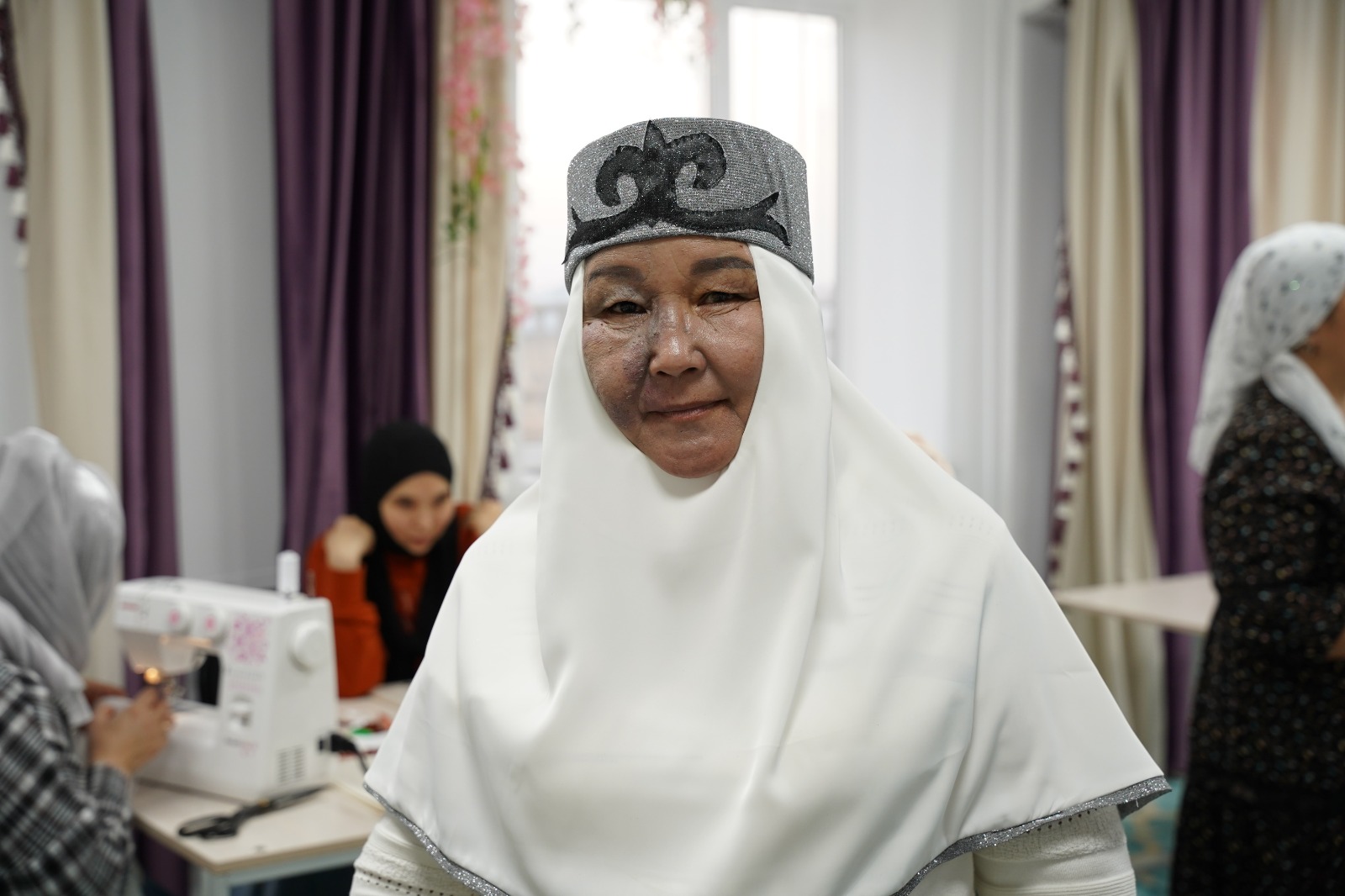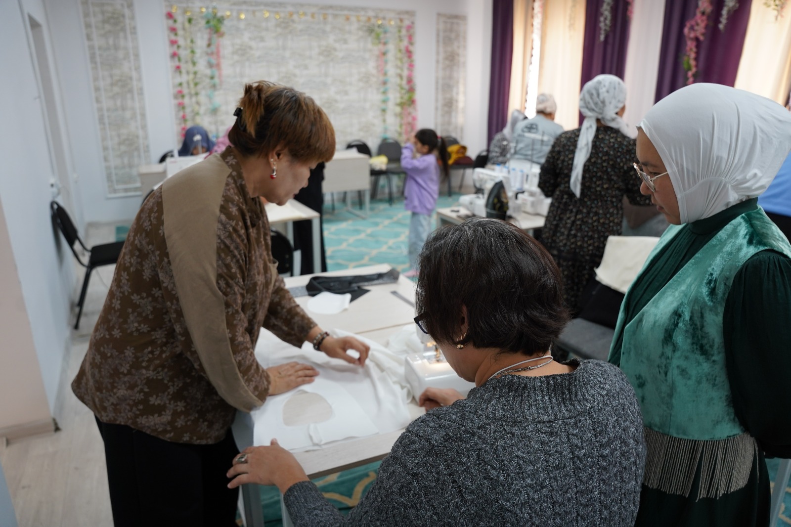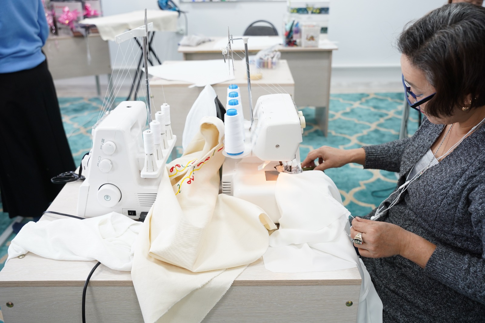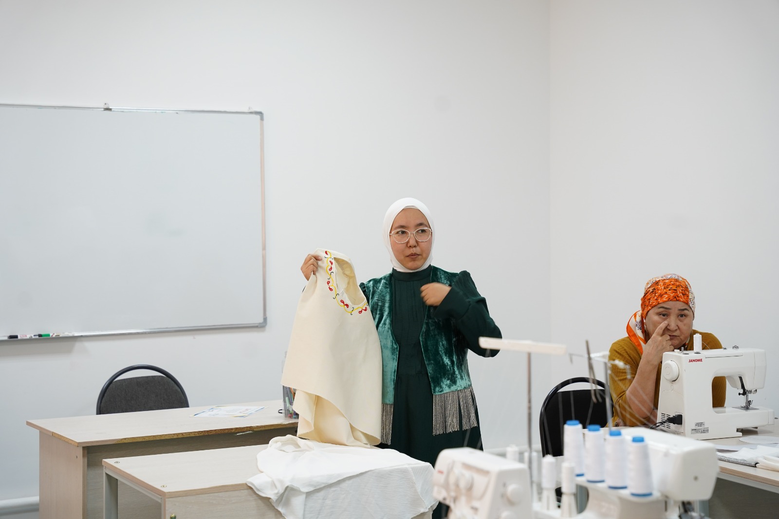 Игі шарада тігінші Гүлбану Ыбрайымқызы әйел жамағатына кимешек тігуден шеберлік сағатын өткізіп, кимешекті пішу,тігу әдістерімен бөлісті.