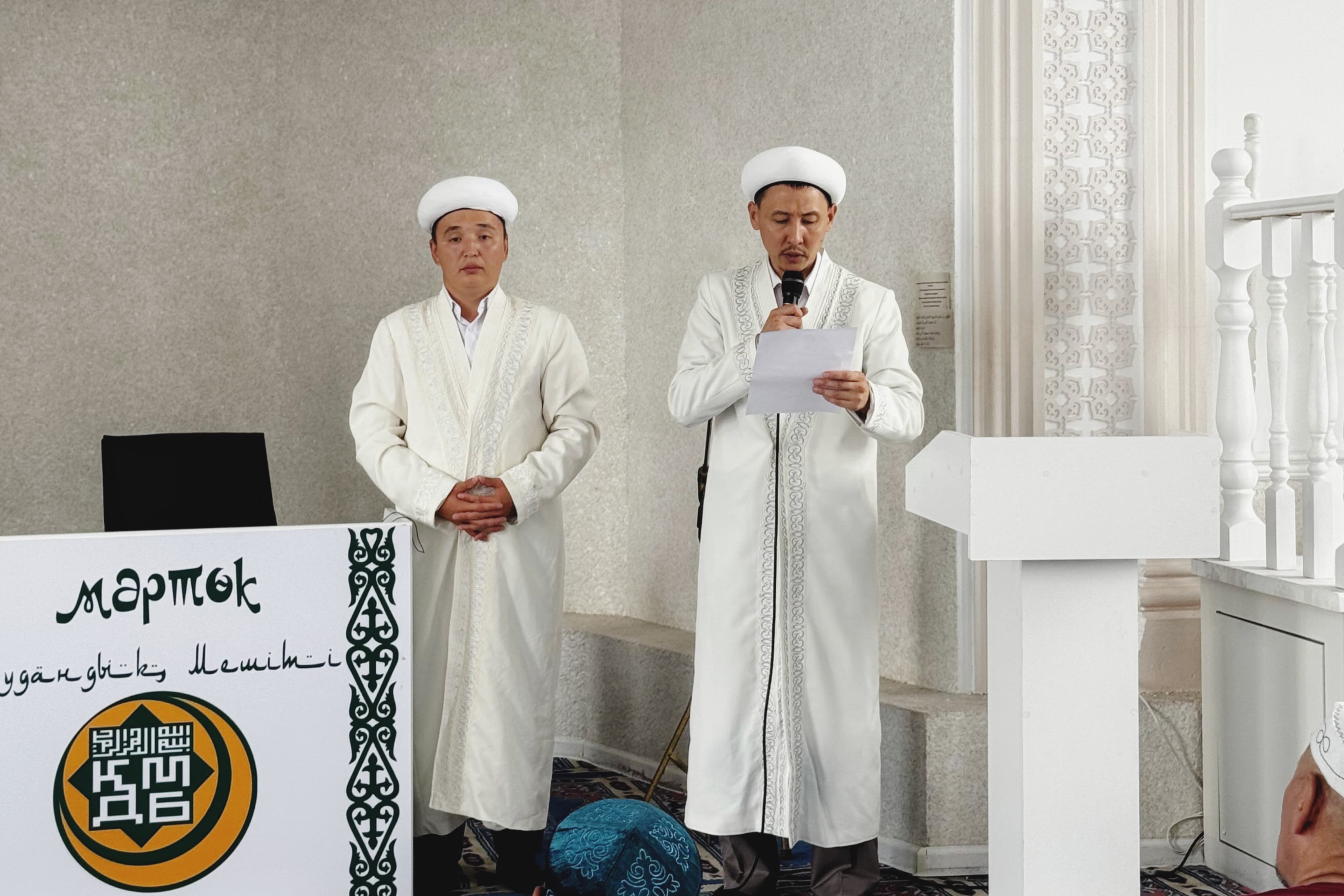 ҚМДБ Ақтөбе облысы өкілдігінен арнайы келген Ақтөбе облыстық орталық «Нұр Ғасыр» мешітінің наиб имамы Махамбет Бисенов Бас мүфтидің бұйрығын оқып берді. Жаңадан тағайындалған бас имам Нұрберген Қазеновты таныстырып, қызметіне сәттілік тіледі. Өз кезегінде осы уақытқа дейін Мәртөк ауданының бас имамы қызметін атқарған Марал Иманғалиға ризашылығын білдірді.