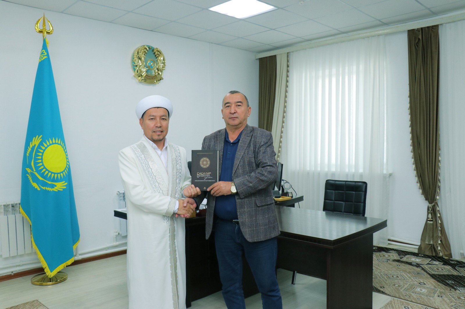 Амантай Садиев «Мүфтият» баспасынан шыққан «Бабалар ізімен: Қазақ даласындағы мұсылмандық мектеп» кітабын аудан әкіміне сыйға тарту етті.