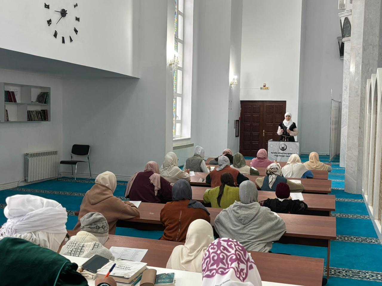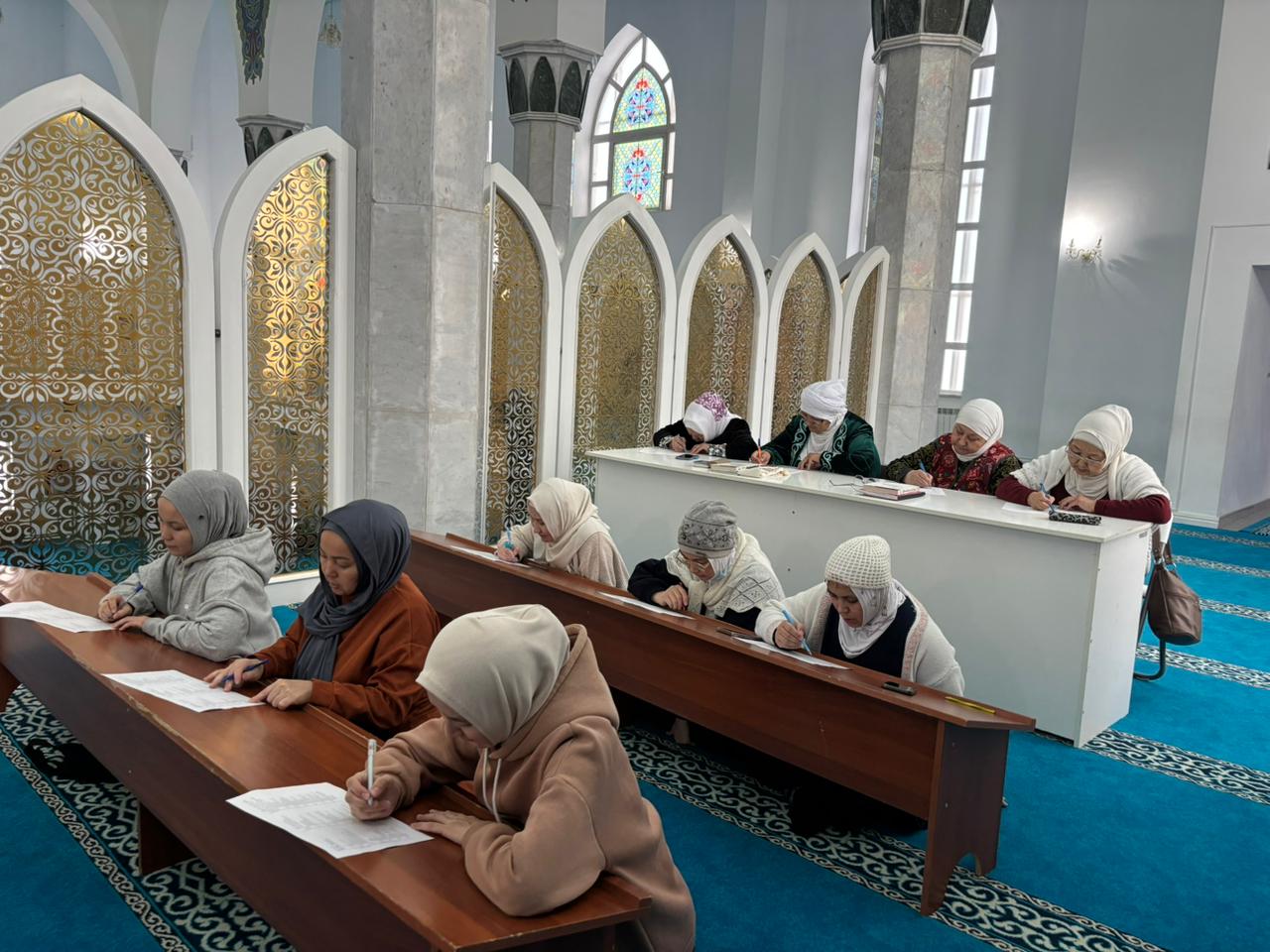Ақтөбе қаласындағы облыстық орталық «Нұр Ғасыр» мешітінде діни сауатын ашып жатқан әйел жамағатынан ұстаз Кенжегүл Кушкарова аралық бақылау алды.