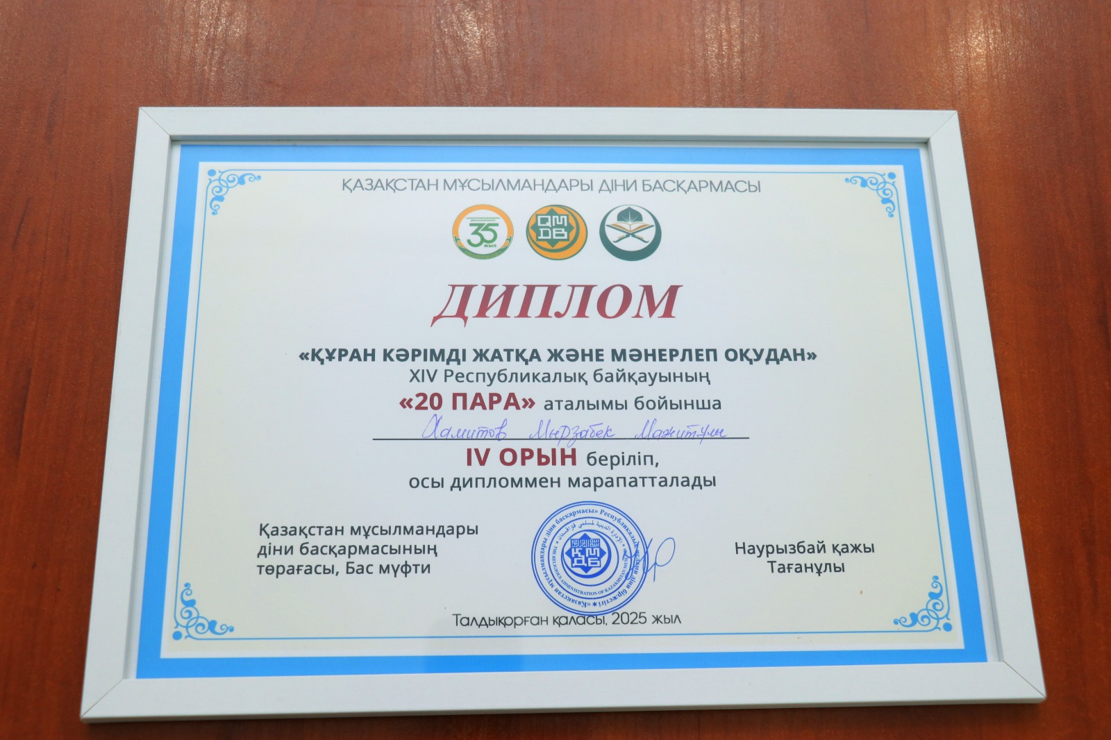 80 үміткер қатысқан байқауда Ақтөбе өңірінің атынан барған Хамитов Мырзабек Құранның 20 парасын жатқа оқу номинациясы бойынша 4-орынды иеленіп, 800 000 теңге сыйақыны қанжығасына байлады.