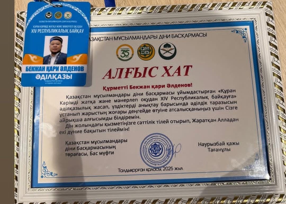 Республикалық Құран жарысына жылда ақтөбеден қатысатын қариларға жауапты болып баратын едім, биыл төреші болдым, керемет өтті. Бас мүфти екі күн бойы төреші болып қызмет еткенімізге еңбегімізді бағалап алғыс хатпен марапаттады.